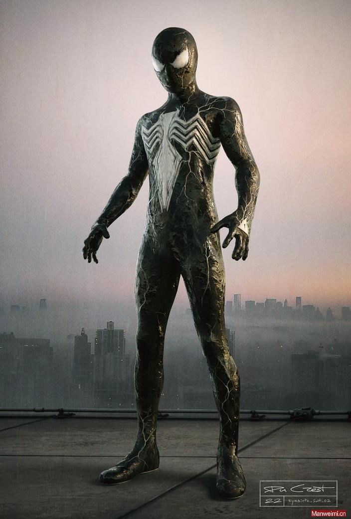 佩雷斯透露,MCU 版共生体战衣的最终设计,大概率是 “直接复制粘贴” 了 MCU 概念艺术家托马斯・杜克雷斯特(Thomas DuCrest)2022 年在社交平台发布的概念图。这位艺术家当时公开的黑战衣设计极具颠覆性:整体呈现黑暗粗糙的质感,覆盖着类似外星生物的黏腻纹理,全身布满凸起的黑白交织纹路,完全跳出了传统战衣的框架。
