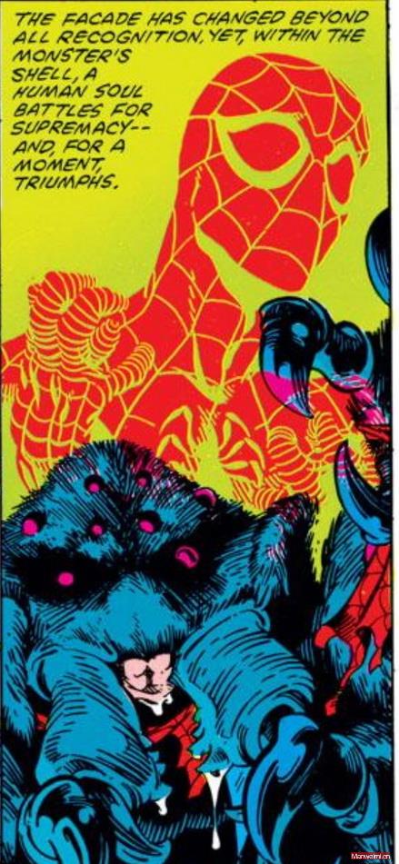 值得注意的是,不同媒介中的蜘蛛怪人,细节上略有差异:漫画《Marvel Fanfare》中的蜘蛛怪人,虽然外表恐怖,但仍保留了部分彼得的意识和沟通能力,甚至曾在野性压倒理智前,恳求盟友杀死自己,以免自己沦为伤害他人的怪物;而《蜘蛛侠:动画系列》中的蜘蛛怪人,則完全丧失了言语能力,只能通过本能行动,更凸显了“失控”的恐怖。这种差异,也反映了创作者的不同侧重:漫画更强调彼得的内心理挣扎,而动画更侧重蜘蛛怪人“怪物”的惊悚感。