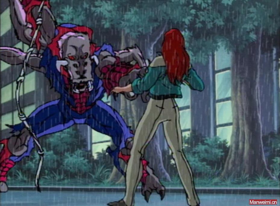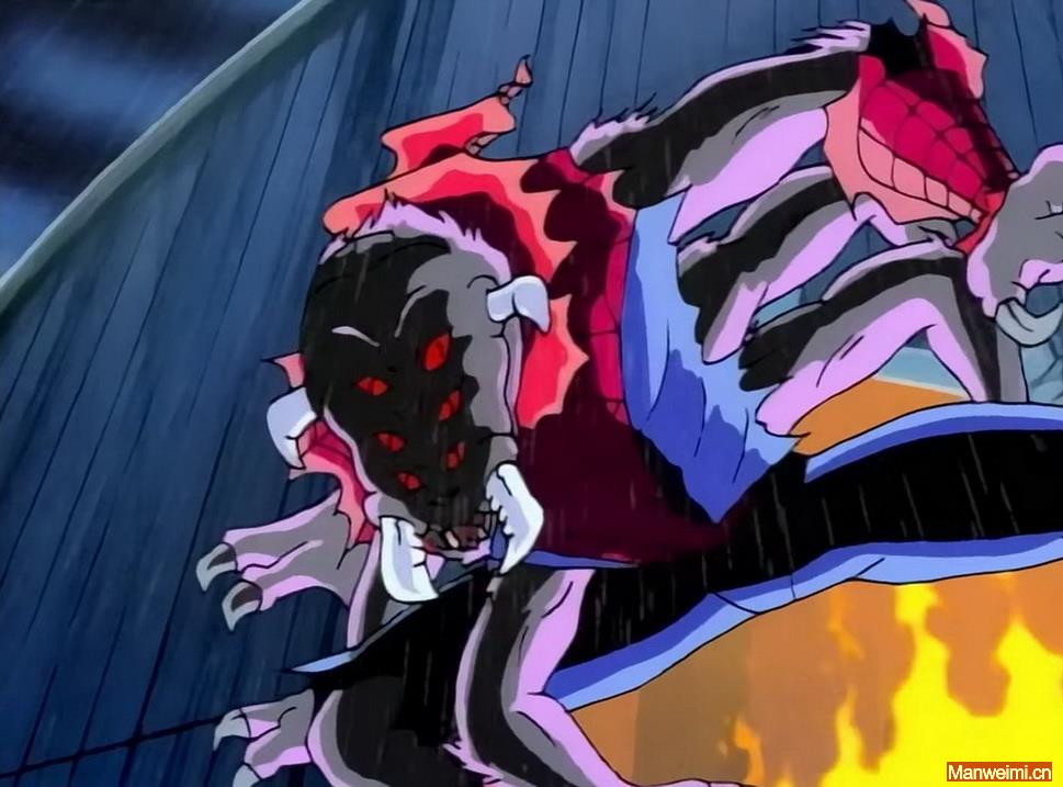 但劣势同样致命,蜘蛛怪人的智能和人性,会彻底退化。变异后,彼得的大脑会被野兽般的本能取代,失去语言能力,无法与他人交流,只剩下原始的攻击、防御和逃跑反应。在动画中,他虽然还残存着对玛丽·简等亲友的模糊情感,会本能地寻找他们,但他的举动,在他人眼中,全是野兽的袭击——他只能发出悲鸣,狼狈逃离,成为一个“被全世界误解的怪物”。