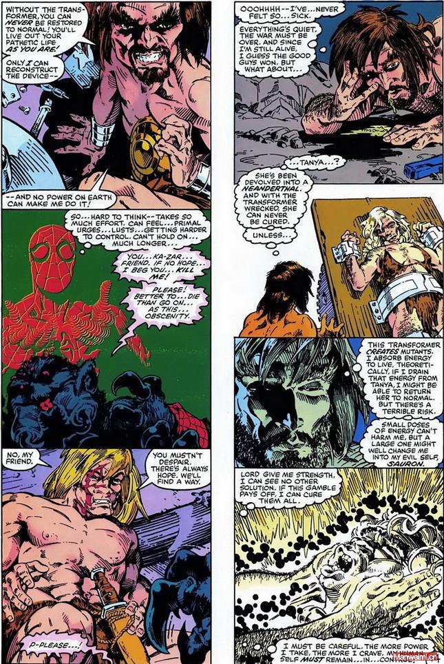 故事的开端,彼得与X战警的“天使”沃伦·肯尼思·沃辛顿三世,一同被反派智核(Brainchild)掳至危机四伏的蛮荒之地(Savage Land)。智核是一个残忍的变种人反派,他强行对彼得进行基因实验,目的就是激发他体内的蜘蛛基因,将他彻底“退化”成原始的蜘蛛混种怪物。