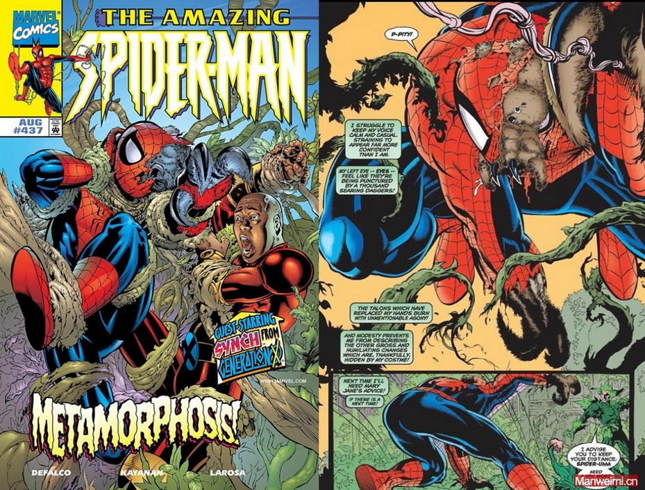 1998年,变异的阴影再次笼罩彼得。在《The Amazing Spider-Man》#437中,彼得与变种人团队“X世代(Generation X)”的少年“同步(Synch)”,一同卷入了反派“植物人(Plantman)”的阴谋。植物人散播的变异花粉,导致城市中无数人发生基因异变,蜘蛛侠也不幸中招。