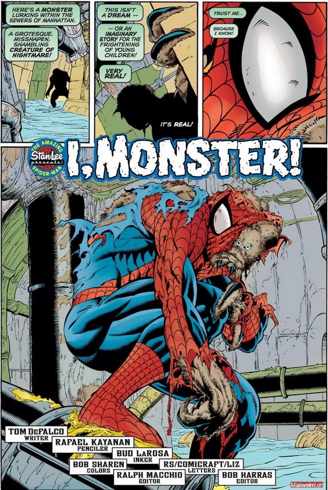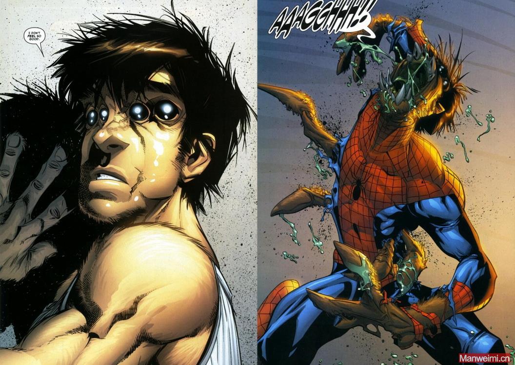 这次的异变,虽然没有蛮荒之地那次彻底,但也让彼得的身体开始向畸形的蛛形怪态扭曲。当期漫画的标题,更是直白地写下了“I, Monster!”(我,怪物!),直接点出了彼得当时的心境——他害怕自己彻底变成怪物,害怕自己伤害到身边的人。最终,彼得凭借极强的毅力,击败了植物人,夺取了解药,才得以逆转变异。但这次经历也证明:蜘蛛怪人的诅咒,从未真正离去,一次意外,就可能让他重陷魔掌。