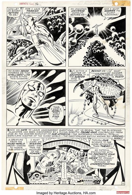 此次拍卖由知名漫画艺术品拍卖行遗产拍卖行(Heritage Auctions)主持,标的为编号Lot #51010的《神奇四侠》第76期单页原画。这幅作品由“漫威漫画之神”杰克·科比亲自绘制线稿,再由传奇墨线师乔·西诺特(Joe Sinnott)完成上色与细节刻画。遗产拍卖行的描述中,特别强调这幅画的独特魅力:科比的粗犷笔触勾勒出充满想象力的宇宙场景,画面中反派“心理人(Psycho-Man)”首次登场,西诺特的墨线处理则赋予画面纵深感与立体层次,仿佛能将读者直接拽入微观宇宙的冒险现场。
